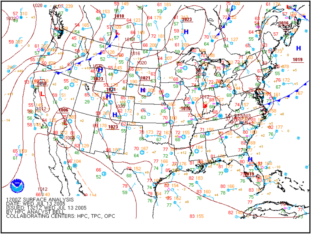 The surface analysis chart is an analyzed chart of surface weather observations. The chart shows frontal positions, pressure patterns, temperature, dew point, wind, weather, and obstructions to vision as of the valid time of the chart.