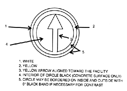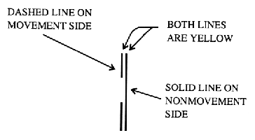 These markings are used to define a roadway for vehicle operations on or crossing areas that are also intended for aircraft. These markings consist of white solid lines on each edge of the roadway and a dashed line to separate lanes on the roadway. Zipper markings are sometimes used in place of solid lines to delineate the roadway edges.