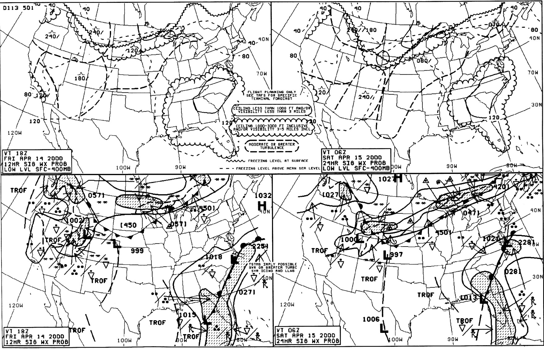 Marginal VFR and IFR weather are shown by waved and solid lines, respectively. The long dashed lines across the chart indicate the altitudes at which the air temperature is zero degrees Celsius, the freezing level.