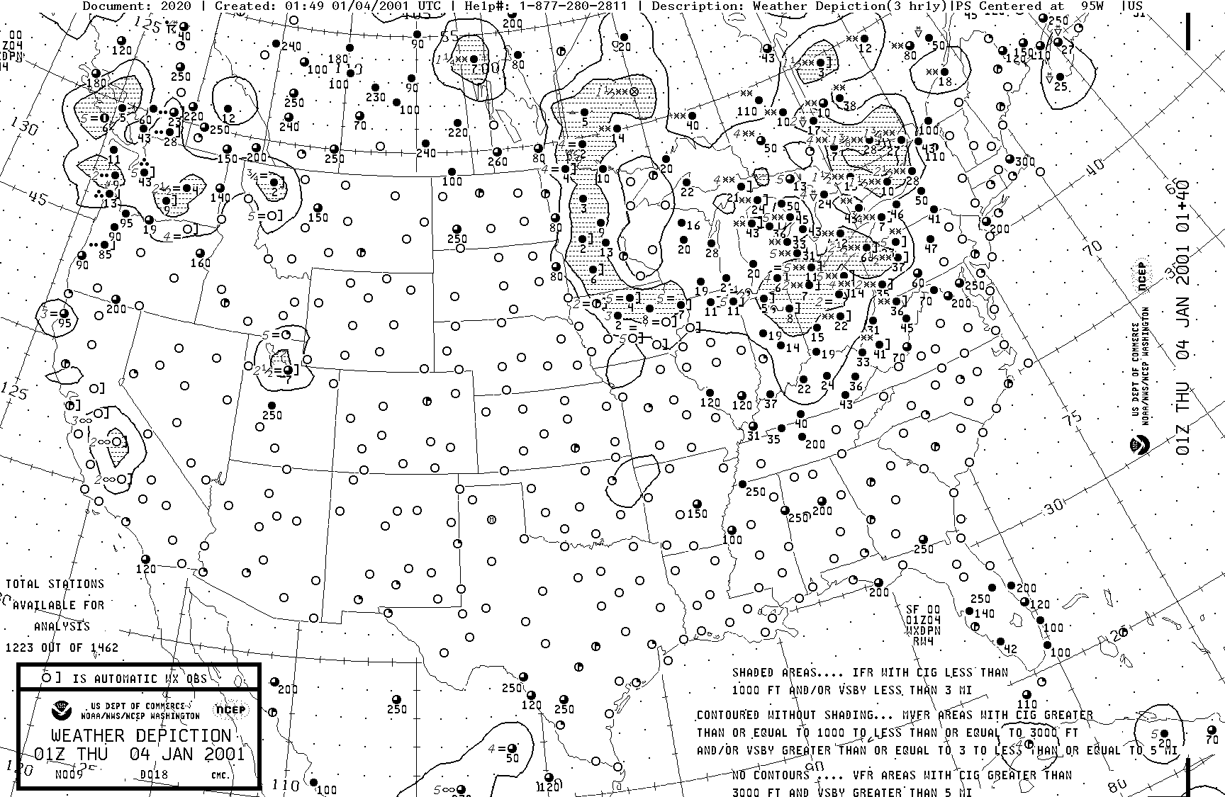 The weather depiction chart, which is issued every three hours, shows weather conditions at certain weather stations, and also displays the weather conditions in terms of visual, marginal, and instrument. It provides a bigger picture, and is useful for initial flight planning.