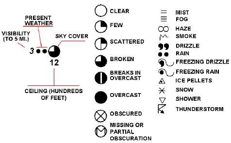On the chart, a station model shows the sky condition as the portion of the station symbol which is filled.