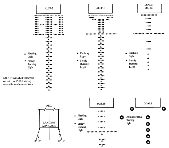 The graphic below illustrates the appearance of the different types of approach lighting systems you may encounter.