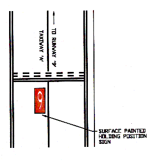Surface painted holding position signs may be used to aid pilots in determining the holding position. These signs consist of a white inscription on a red background painted on the left side of the taxiway centerline. These markings are used to supplement the holding position signs, which are located adjacent to the holding position.