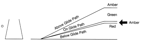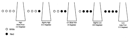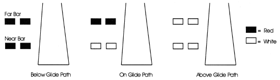 A VASI system normally consists of two light bars located on the left or right side of the approach end of the runway. An on glide path indication is provided when the top or far bar is red, while the bottom or closer bar is white. Red over red is a below glide path indication, and white over white is an above glide path indication.