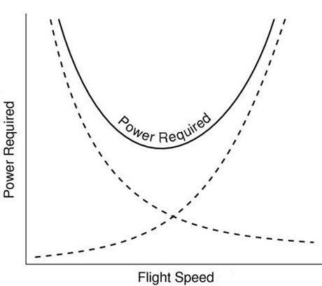 The amount of engine power required for the propeller to make enough thrust to counter total drag varies with airspeed, since drag varies with airspeed. The engine power required for different airspeeds is shown graphically in the power curve. It can be seen that the minimum power is required at the least drag airspeed. At any other speed, faster or slower, more power is required. At slow speeds near the stalling speed of the wing, the induced drag is so great, that the power required is very high.