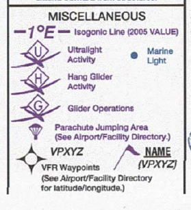 When an airport contains special activities, such as parachuting or glider activity, it is depicted according to the legend, as shown below.
