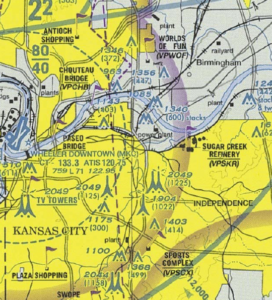Magenta flags denote visual checkpoints, which can be used to declare your position to air traffic control. A pilot wishing to communicate with the tower at Kansas City Downtown airport could report position in simple terms, such as "over sugar creek refinery". Because the refinery is a visual checkpoint, the tower controller will know your position based on this report.