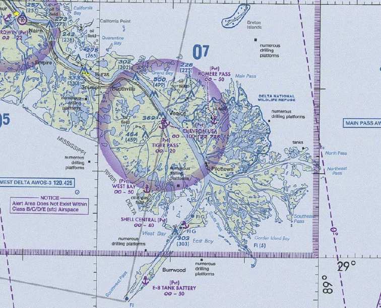 For example, the photo below shows a portion of the New Orleans sectional chart, which depicts the Mississippi river delta.
