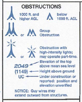 Obstructions may be grouped to avoid chart congestion. MSL and AGL height is shown for each obstruction or group of obstructions. "UC" means the obstruction is under construction.