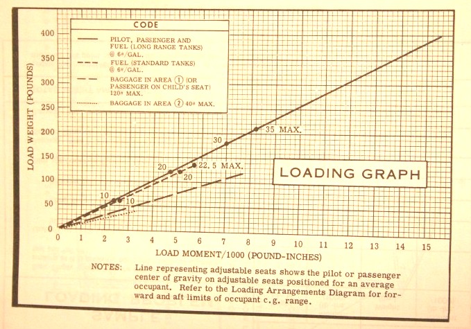Some manufacturers provide graphs, which the pilot uses to determine the weight and balance of the airplane. The loading graph below is taken from the pilot's handbook of a Cessna 150. The loading graph is used to calculate the moments of loads as they are added.